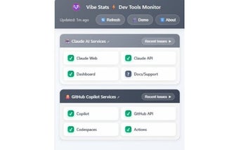 Vibe Stats - AI Dev Tools Monitorは、Claude AIやGitHub Copilotなどの主要な開発者ツールのステータスをユーザーに知らせるために設計されたChromeおよびEdgeの拡張機能です。この無料のアドオンは、これらのサービスの運用状況を5分ごとにチェックし、リアルタイムの更新を提供します。ユーザーは、必要に応じて詳細なインシデント情報を表示する明確で魅力的なポップアップインターフェースを通じて、これらのツールの健康状態を簡単に追跡できます。